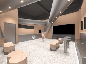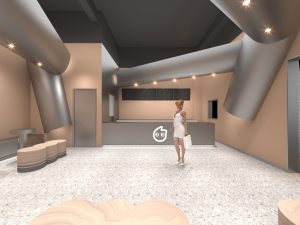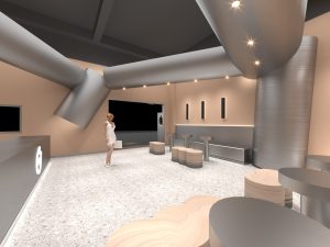 原本完整的金属板经过挤压裁切成几片形态各异的造型,其中三片曲面金属板被安排在入口处,包裹原建筑门头,以吸引来来往往的人群注目。
