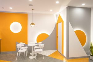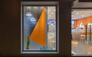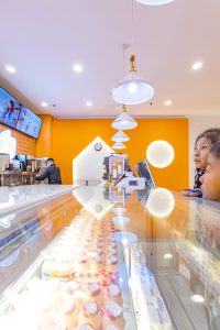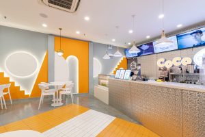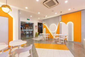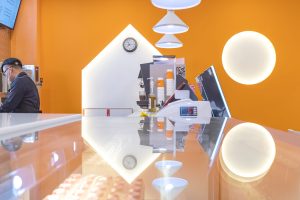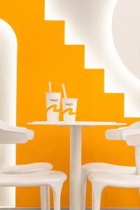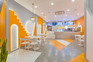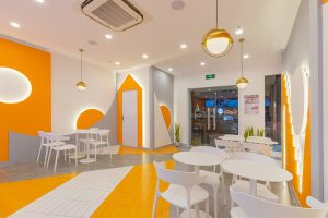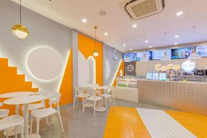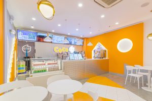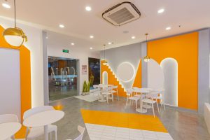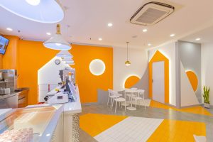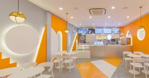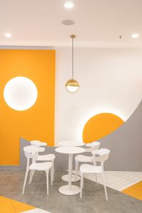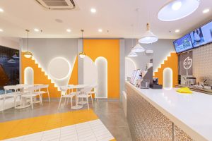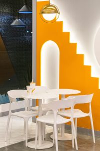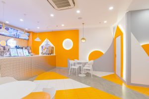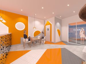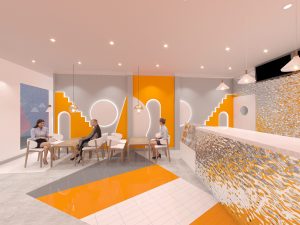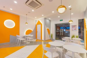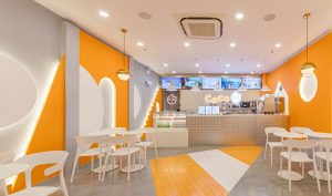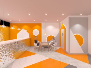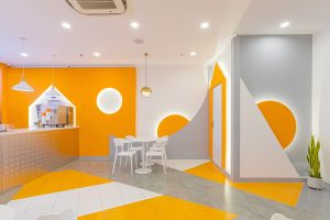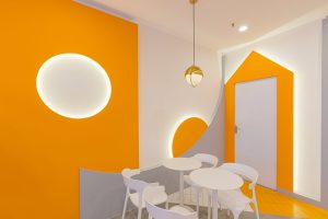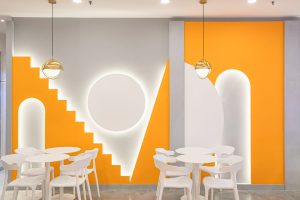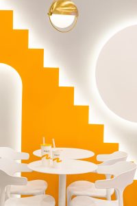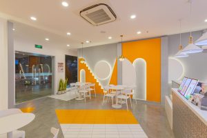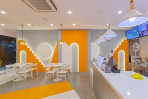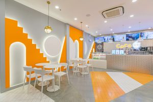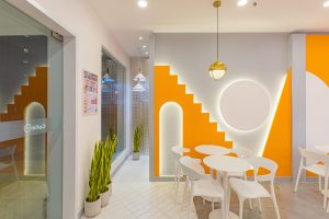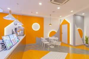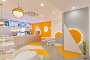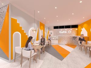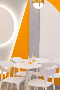 空间设计以高级、优雅、轻松的氛围去考虑的。设计手法上引用了错层、穿透、连贯、主要体现空间感。以时尚元素为主导,以橙、白、灰色系为主色调,从视觉、触觉多方位营造时尚感染力,捕捉消费者内心最深处对时尚感的需求,从而很好地与COCO都可“正面、积极、活力、阳光、亲和、温度”的口号相契合。设计师认为,设计作品应该和人产生互动,让人情感得以满足,空间与人之间不一样的互动,造就了不一样的空间魅力。即能借助于丰富的场景来开启对于过往青春及未来生活的美好想象。