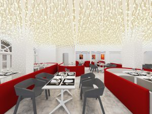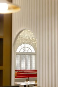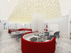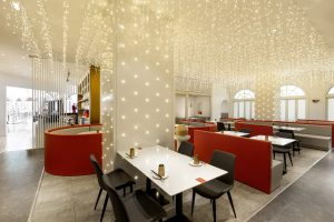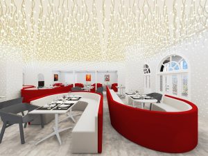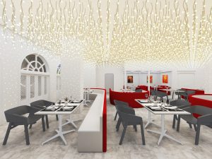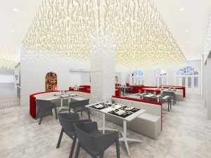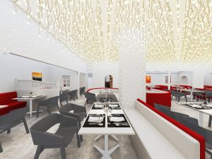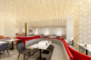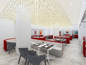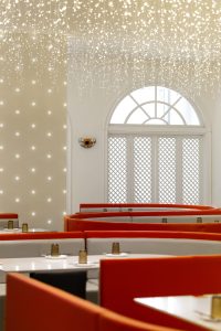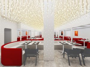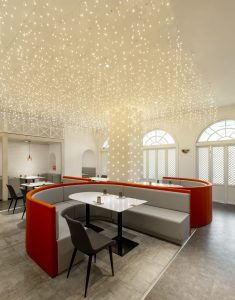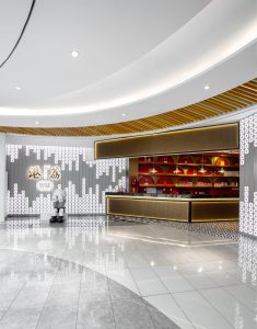 餐饮室内部分,我们采用打破传统餐饮公共大空间的布局方式,沙发采用流线型设计,以金属板搭配灯珠为背景墙面,将客座、等候区 、景观、吧台等功能结合,形成更加多变的餐饮体验空间。赋予了空间新的视觉焦点,激发客人进入探寻的好奇心。