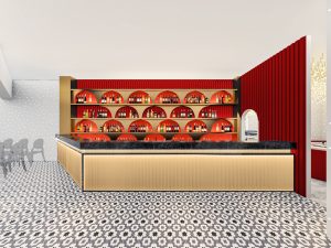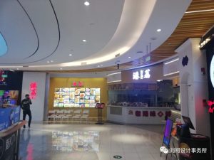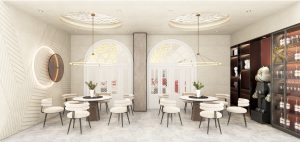 门头区域在满足空间功能需求的前提下,运用现代、简约的设计语言,体现了建筑空间的时代特质,门头logo运用金色背发光,墙面搭配金属板造型,使门头在空间中更加突出,激发消费者驻足产生进店探索的好奇心。