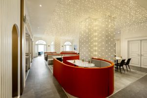 空间整体以白色、港荔红色、金属板为基调,创造一个简单开放的空间、内外融合的舒适场所。
