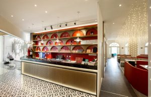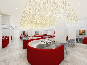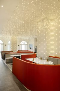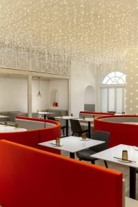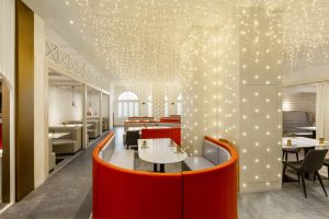 吧台区域采用港荔红色,昭示企业色,营造活力,热情的氛围,同时吧台和客座区中间用格栅板作为分隔,既起到分隔空间的作用,又使得整个空间更加通透、灵动。