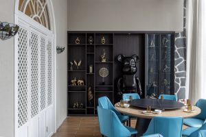 空间底部是弧形的客座区;中间是墙壁上的金属板覆面;上方富有氛围感的灯光,三者融合使空间的层次更加分明。