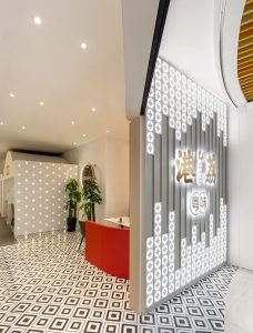 室内雅间区域采用水波纹板搭配浅灰色墙面,使顶部空间板的整洁干净,同时顶部的水波纹板反射的图像,会散布成类似于印象派绘画的视觉效果,极大的加深空间的层次感。