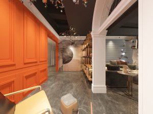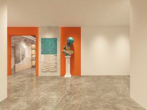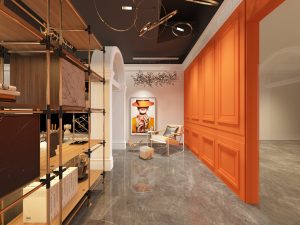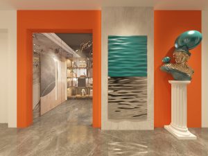 走廊门厅采用神秘尊贵爱马仕橙元素的门头大色块,时尚潮流,与整个白色走廊产生鲜明对比,提升整体环境的质感。