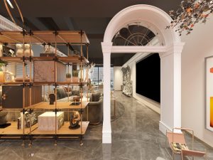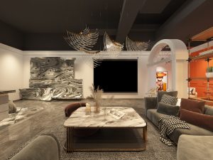 采用最淳朴材质水泥板作LOGO背景墙,水波纹板被巧妙的运用其中,凸显轻奢质感的同时毫无一丝违和感,水泥板两侧为LED线条灯,简洁时尚。合理搭配了富有艺术设计感的石膏艺术装置,充分发挥了爱马仕橙色背景背景墙的神秘尊贵。