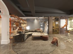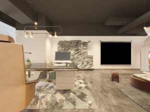 设计说明:走廊门厅和入户门厅采用神秘尊贵爱马仕橙元素,加上接待区沉稳的深灰色,与轻盈的浅灰色搭配,整个空间既简单有序,又充满视觉层次,深浅的色调搭配,大气而简约,尽显轻奢雅致,彰显独特品味和艺术审美。整个空间给人中性色的沉稳,以更感性的特质,带来舒适愉悦的视觉观感。