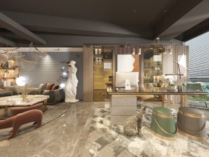 透过玻璃门,入眼可见的是线条动线鲜明的进口瓷砖背景墙和艺术画,凸显视觉层次感。背景墙主要运用了潘多拉星云石,气势磅礴的潘多拉星云石,远看如山恋绵延起伏,细看似雪中梅林,让人入梦如醉。比起瓷砖来更有层次感,再搭配上金色元素的摆放艺术品的的艺术架,整体奢华优雅。