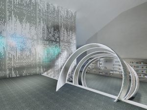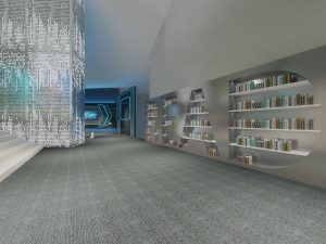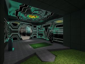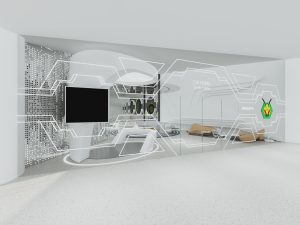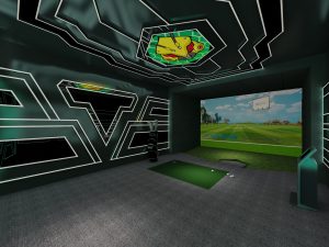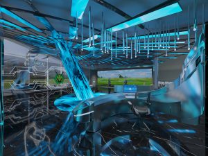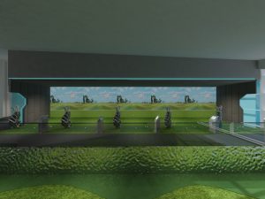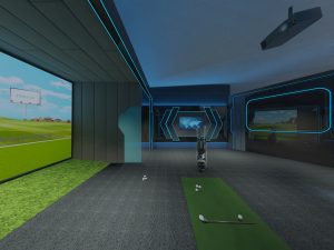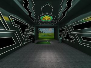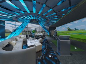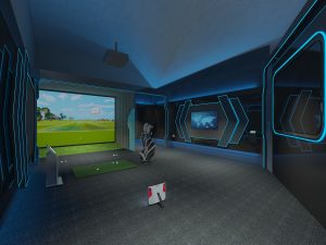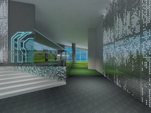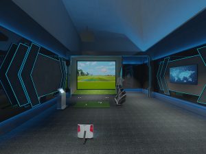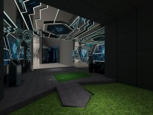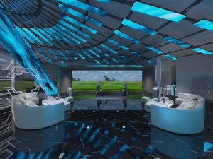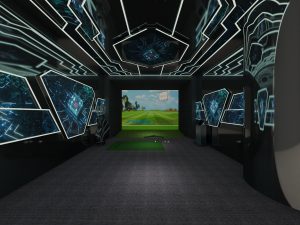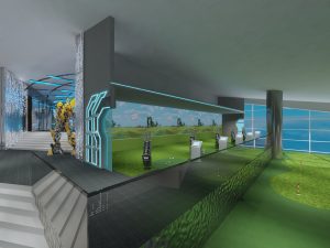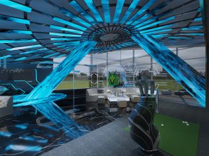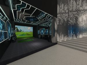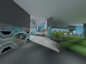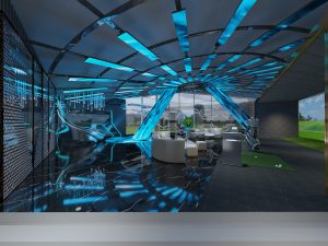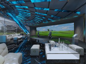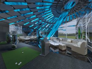 果岭区结合水波纹板的特殊纹理,金属和玻璃材质的结合运用营造出空间的亮点,同时材料本身也具有科技风格,为空间塑造出明快的科幻色彩。