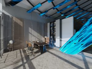在设计的过程中,综合商业属性从而对原有空间进行再生,重现,修补,是本案的阐释重点。在色彩方面,以灰色为基调,商务蓝点缀,以科技感为主题塑造出力度与亮度的空间张力,环形造型设计让整体空间完美融合,极具动感。