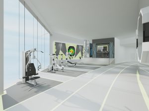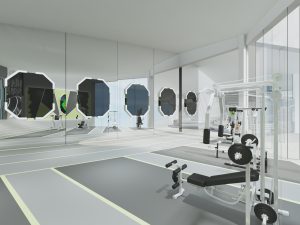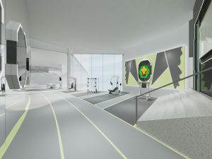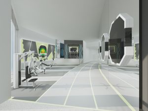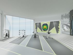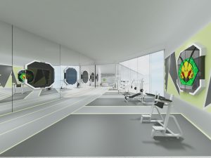 方案中摒弃了复杂的图片堆积式墙面设计,以企业色绿色搭配黑白灰色,不仅能够展现出精致的科技质感,还能将人们的感官焦点彻底拉回到健身本身,同时室内的落地玻璃窗能够充分使室外光线洒落室内,与室内的镜面墙体形成呼应,于空间衍生空间。地面线条划分在保持空间分区基础上,分流健身于行人的区域路线。