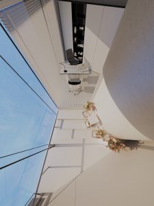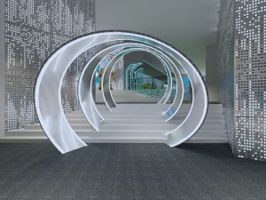 「 时光隧道门 」艺术装置是走廊区的一个亮点,空间中从VIPA外走廊进入,通过一条通道,通道尽头视野豁然开朗,达到视觉盛宴,从而营造一种曲径通幽之感,极具未来感。在材料上选择前卫感十足的金属、玻璃、线条灯等。走廊墙体运用不锈钢洞洞板、洞洞板后采用亚克力打光处理,同时发光体孔洞有密有疏,由墙面至顶部逐步减少,视觉上由沉稳变为轻快,有科幻变幻之感。灯光的作用,则是穿行于建筑空间中,展现出建筑的特有视觉质感。