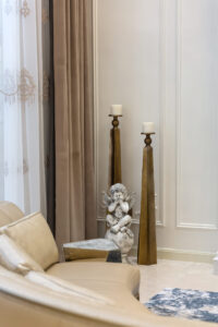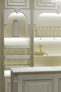 走廊的墙面及顶面采用较多线条的设计,引导观看者把视觉点规整为有次序的视觉元素,通过规整的线条,使空间更干净大方、利利落落;整体色彩以米、灰两色为主,搭配白色、金色等,简单的配色带动视觉变化、使整个空间更加有生命力。