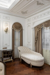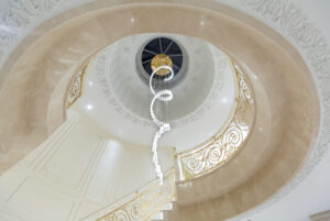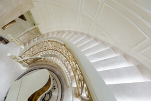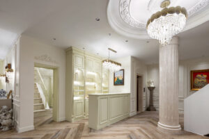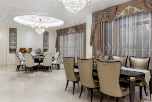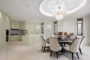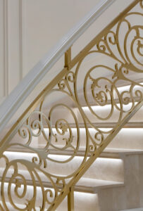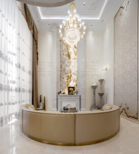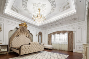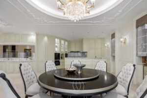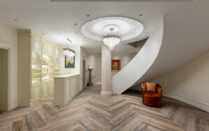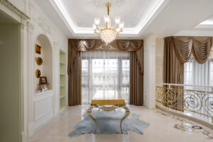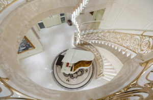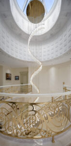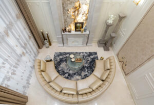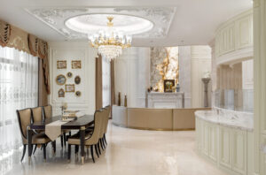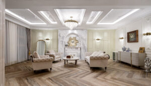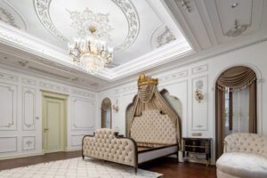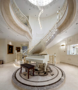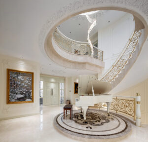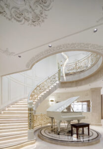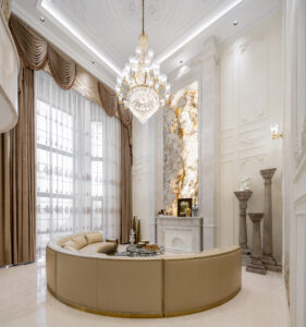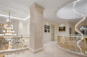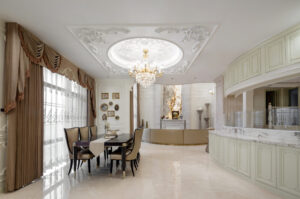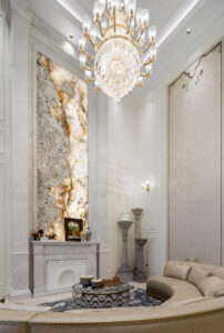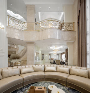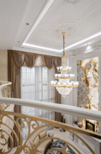 通过灯光的朦胧效果、精致的家具以及经典的装饰风格,每个细节都传递出尊贵与优雅。简洁的单杆旋转楼梯扶手吸引着年轻人的眼球,提供了无限的想象空间;而更为稳重的手扶栏杆款式则适合家庭使用,兼顾了安全与美观。 客厅的挑高设计成为无法忽视的亮点,巨型水晶吊灯、精美墙面和豪华家具共同构成了一幅震撼人心的视觉盛宴,彰显出空间的广阔与气派。复式结构强化了这种宏大的艺术表现力。