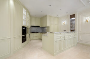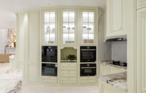 厨房柜体在选样上选择千里烟波—蒸汽灰。略带烟水气息的蒸汽灰作为柜体颜色,表面用线条简洁勾勒。