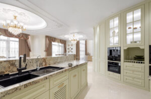 厨房区域在家具的选择上结构粗厚,家具材料使用的种类多,比如木质结构家具、软质沙发,讲究实用性、舒适性,体现高品味的生活。