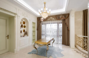 挑空客厅在整体设计中绝对是点睛之笔,硕大的水晶吊灯、华丽的墙面、高贵的家具等,无一不给人极强的视觉冲击力,使得房间更加辽阔宽广。增加复式楼的宏伟壮观气势,体现出超强的艺术表现形式。