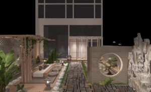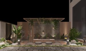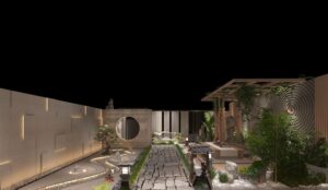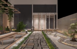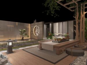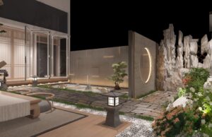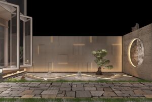 庭院设计中,夜间灯光的对于整个庭院氛围气质起到的作用也非常重要。灯光的设计更多采用隐形流线灯光处理,将院墙以及景观映射出最佳的美感。