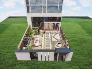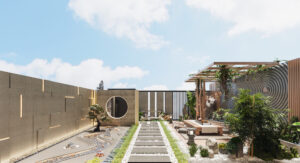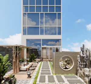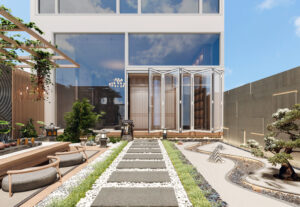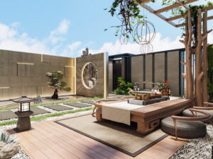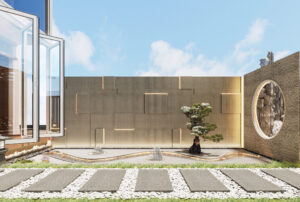 院子入门处的屏风墙为一面圆形镂空白墙,使得院内的枯山水景观在入门的一刻尽收眼底,与右侧的中式山石形成一幅天然的画屏,对于整个庭院的构造兼具了观赏性与实用性。