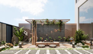 绿植架垂钓下来的绿意以及茶席两侧的竹叶等中式园林元素的植物更为日常休闲及会客营造出一个宁静自然气息的空间。